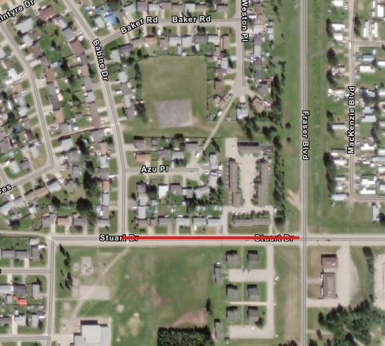 Stuart Drive is closed between Babine Drive and Fraser Boulevard, including the sidewalk.BC Hydro is completing line upgrades in the area.
